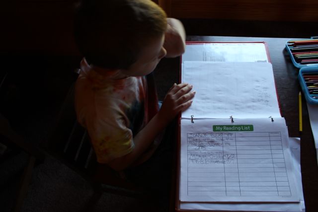 Although we read from the literature selections as noted in our reading plan, we don’t stick strictly to the order or schedule on our daily checklists. Sometimes there’s a 30-minute delay because someone cannot find his IEW notebook. Other times we decide to work on a Homeschool in the Woods project in the afternoon (or evening or weekend). And over the course of our day, Levi is usually playing, coloring, or working in his notebook. [Read more about Levi and his preschool ways.]