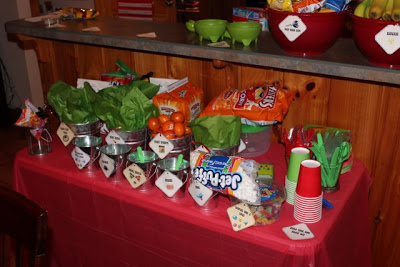 Unfortunately, I forgot to take photos of the spread after everything was in place but before our guests arrived…. However, before we emptied the packages of junk food into each of the buckets, this is what it looked like: