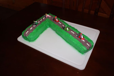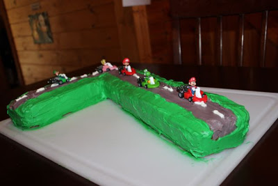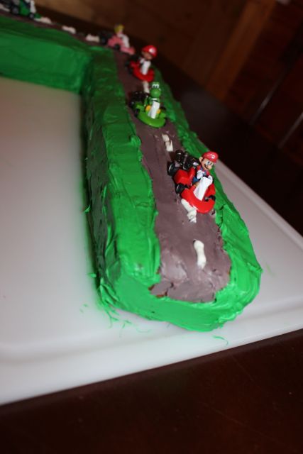 This was so easy that it doesn’t even require an in-between photo. I just cut one of the pound cakes to piece together a number 7 and slapped a bunch of icing onto it. I bought some Mario Kart racers as toppers and voila! This was way easier than the dump truck (but not quite as fun to build!).