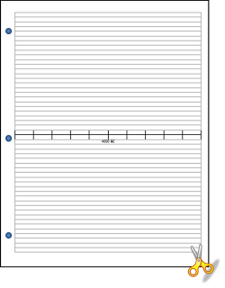 Print on cardstock paper for durability. Determine how much of the timeline you would like to see at one time. (For our purposes right now, we taped 10 pages together to span 1,000 years, for a total of six notebook accordion pages.) Hole punch the first page for that interval. (To reinforce the holes, tape the right edge/margin with clear packaging tape before hole punching.) Cut off the right edge margin.