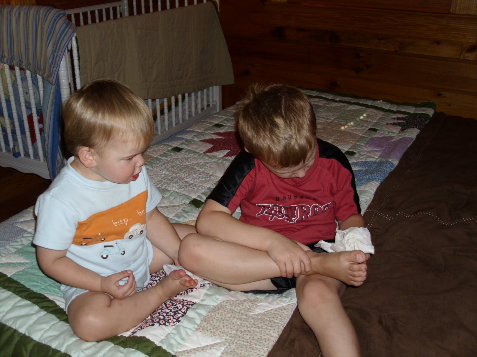 Levi and David both have baby wipes. Levi is studying David’s techniques and mimicking him. |