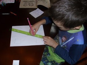 As mentioned previously, a great place for art ideas is Art Projects for Kids. As an eight-year-old, Stephen completed this 1-point perspective activity at home as I was trying to figure out what would be appropriate for his co-op class.