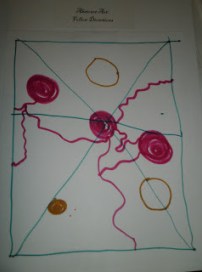 Abstract Idea #2: Another favorite activity is the “Abstract Name.” Write the first letter of your name. Turn the page 90 degrees and write the second letter of your name. Turn the page 90 degrees and write the third letter of your name… and so on. Then color in with markers, switching colors every time you come to a line.