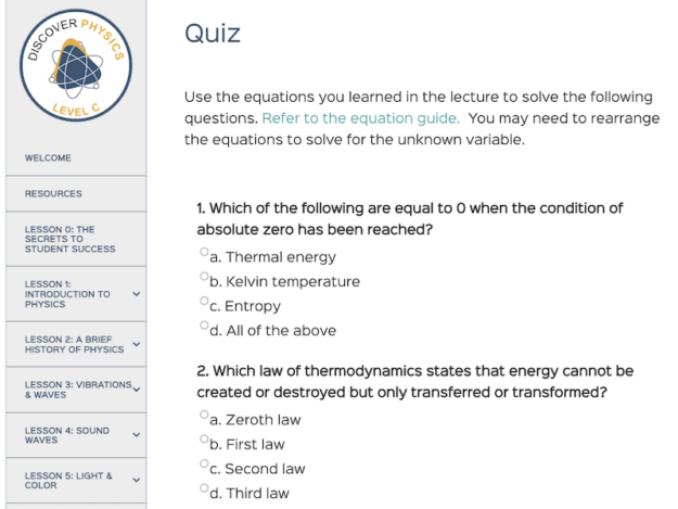 Test drive a free lesson! Click here to preview Lesson 1: Introduction to Physics and Lesson 13: Two Dimensional Motion (along with a download of a student packet which includes the lesson’s outlines, quiz, homework questions (with video solutions!), and lab instructions).