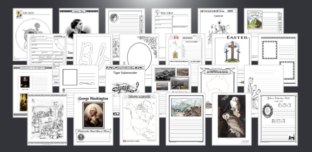 Notebooking Pages provides visually-appealing templates for hundreds of topics, including Bible, missionaries, geography/maps, nature study, history, artists, composers, literature, and more. A personal favorite includes the science-related pages, as many of them include coloring sheets for younger children and diagrams of the human body systems, flowers and trees, and physical science concepts.