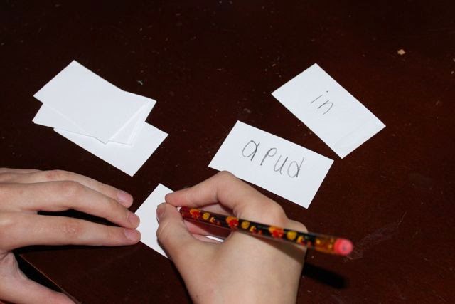 Though we’ve used flashcards in the traditional way, we also use them to play games.  The following are games to play with the Latin and English words on separate cards.