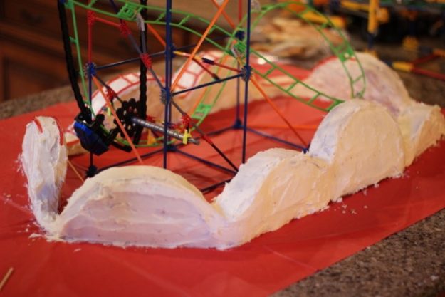 My original plan was to create trusses with pretzel sticks, but I ran out of time. Plus, Levi told me it was finished *just like this,* so we propped up a few of the taller roller coaster hills with skewers and shifted our focus to other food stuff. The real hit wasn’t the roller coaster cake, anyway, but what the boys added to it: K’nex, Lego, Technic, and robots. Our home was (and still is) overrun by boy-built creations.