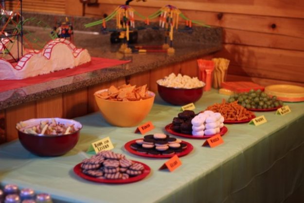 Fortunately for us, we already had a large collection of K’nex structures on hand. All I had to do was come up with a cake to accent their work, along with some clever party food labels (because party food labels remain a favorite birthday request amongst our children). So… what goes with a K’nex Roller Coaster?