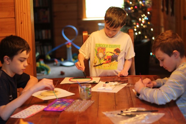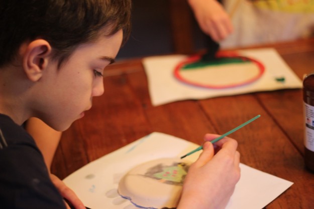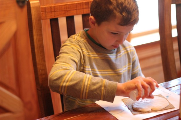 Stephen (pictured above) painted with watercolors, and the other two boys painted with tempera paints. To better seal the paints in a fresco-secco, you can brush a layer of white glue on the surface. You can also brush a layer of glue on the back of the burlap mold to increase its durability.