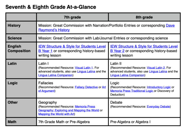 However, some of our suggested resources for certain subjects (such as logic and Latin) will depend on the grade level instead of the content in Mission: Great Commission. Below is our suggested scope and sequence for seventh and eighth grade along with an explanation of each subject and our corresponding recommendations.