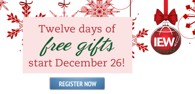 Be sure to sign up for email reminders for the annual 12 Days of Christmas Giving Event (Dec. 26 – Jan. 6) where IEW provides free audios and printable resources from their award-winning products. They always offer such fantastic freebies! (They’ve even sent out – absolutely free – physical products that help with grammar and writing. It boggles my mind that we’ve received free portable walls, Grammar-on-the-Go charts, and Fix-It Grammar workbooks!) I always look forward to this event after Christmas!