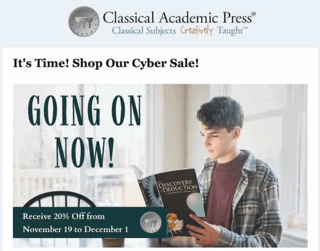 Classical Academic Press offers some of our top picks for literature guides (Walking to Wisdom), logic/fallacies/debate (Art of Argument & Everyday Debate), and composition (Writing & Rhetoric). From November 19 to December 1, receive 20% off all non-digital CAP products* and free shipping on all orders over $75. Discount automatically applies at checkout.
