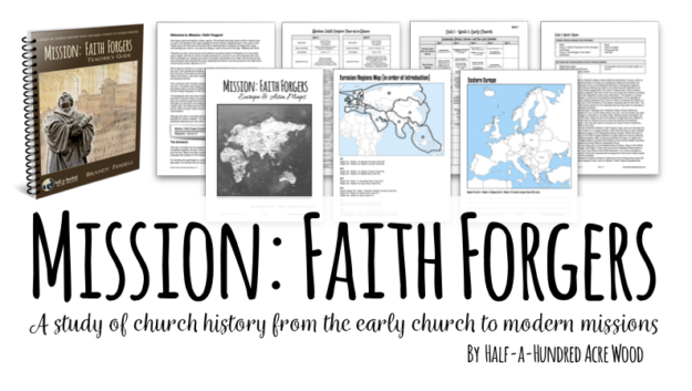 Written for families with students in Grades 2-8 (and beyond), Mission: Faith Forgers is an integrated study of church history, world geography, cultures, religions, and missions through the wonders God has worked from creation (astronomy) through today using people who were willing to follow His call – with a focus on the history of Christianity from the early church to modern missions in Europe and Asia. (To see the first six weeks in action, click here.)