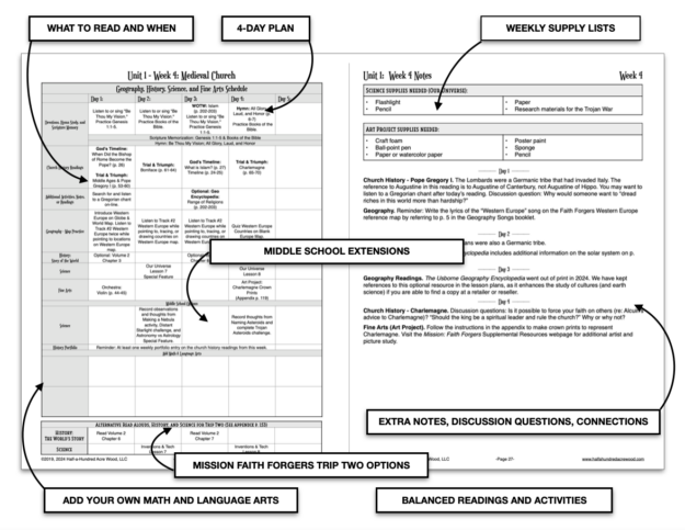 What holds it all together? The Mission: Faith Forgers Teacher’s Guide! This reading plan is divided into six separate units of six weeks each to provide flexibility for families. Completed together, the study offers a full 36-week course of study for science, world history, church history, geography, and fine arts. Alternatively, families may adjust their schedules to complete fewer units or subjects if needed.