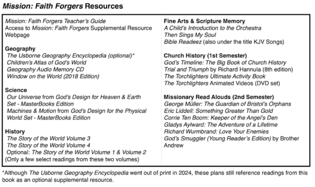 The image below provides a list of the books used in Mission: Faith Forgers.