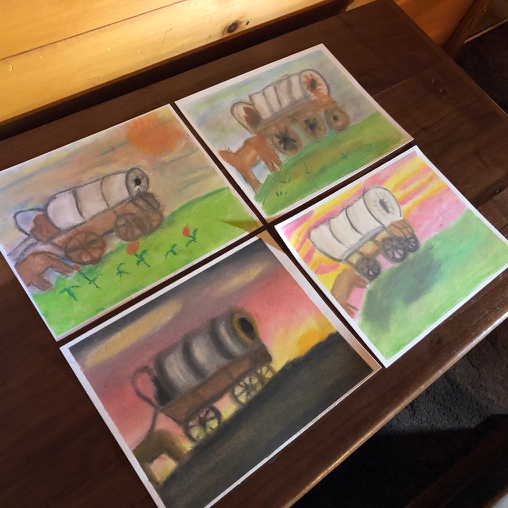 While I do know a bit about color, balance, blending, and technique (always learning!), other moms have not only spent years practicing and perfecting techniques but also embrace a passion for teaching the subject. This is when an art course like those from Yellow Spot:Sun can take my children much farther than I would have on my own. So… in addition to the history/drawing portfolio entries, we’ve also enjoyed Trailblazing Transit from Yellow Spot:Sun as a supplemental art course that corresponds with Mission: Lasting Liberty. Thus far, we’ve completed a Native American Canoe…