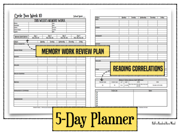Note: CC Memory work is not included in this planner. The only thing that makes this planner a CC cycle-specific planner is the reference to “Cycle Two” in the upper left hand corner and the reading correlations listed on the second page for each week. The reading correlations are to Foundations Guide 5th Edition. If you are using Foundations Guide 4th Edition, history memory work is the same; science references have shifted, but we have included a 4th edition correlation for the Scholastic Science book if you are still using the older edition. Below is an unobstructed view of the layout of the planner pages.