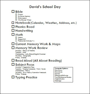 First, there’s the cover…. the school work checklist. Though it looks formidable, it actually takes us step-by-step through the entire day. And there’s something euphoric about checking the boxes on a checklist. (Why else would I add things to my to-do list that I have done, just so that I can check that little box? The boys love checking those little boxes, too.)