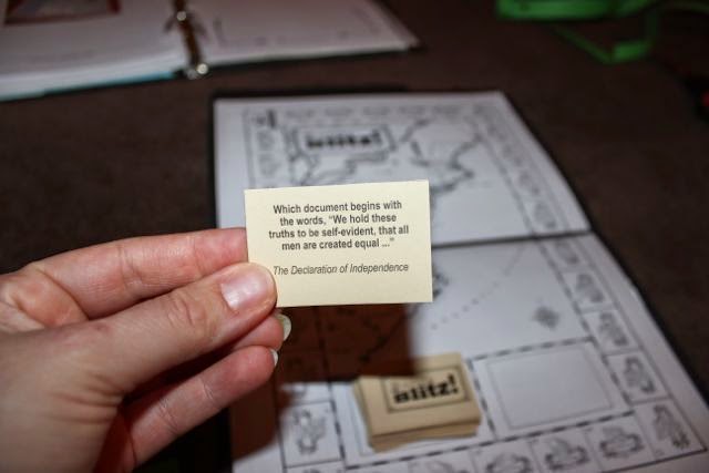 Concluding our American Revolution Study, we played the games Liberty at Last and Battle Blitz! Both gave us a chance to review several weeks of memory work. The Liberty at Last gameboard features a timeline of the American Revolution, and Battle Blitz! focuses on the order and location of battles fought in the war.